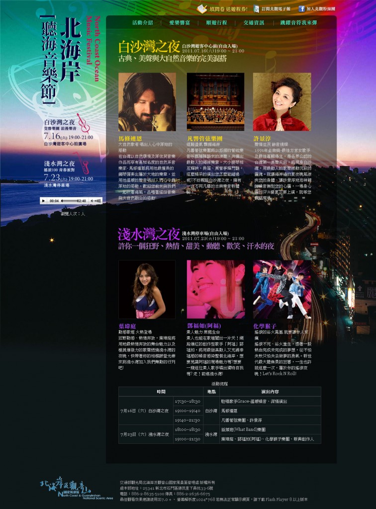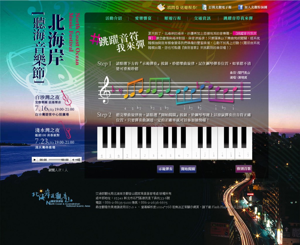 2011北海岸聽音樂節 北海岸及觀音山國家風景區管理處 活動網站 包括聽海音樂節活動,網路行銷活動「跳躍音符我來彈」Flash遊戲,還有滿意度問卷調查,活動結束後用程式隨機抽獎 June 2011 Link 2012/01/14 In Flash, Web Design, Website ← Previous post Next post →