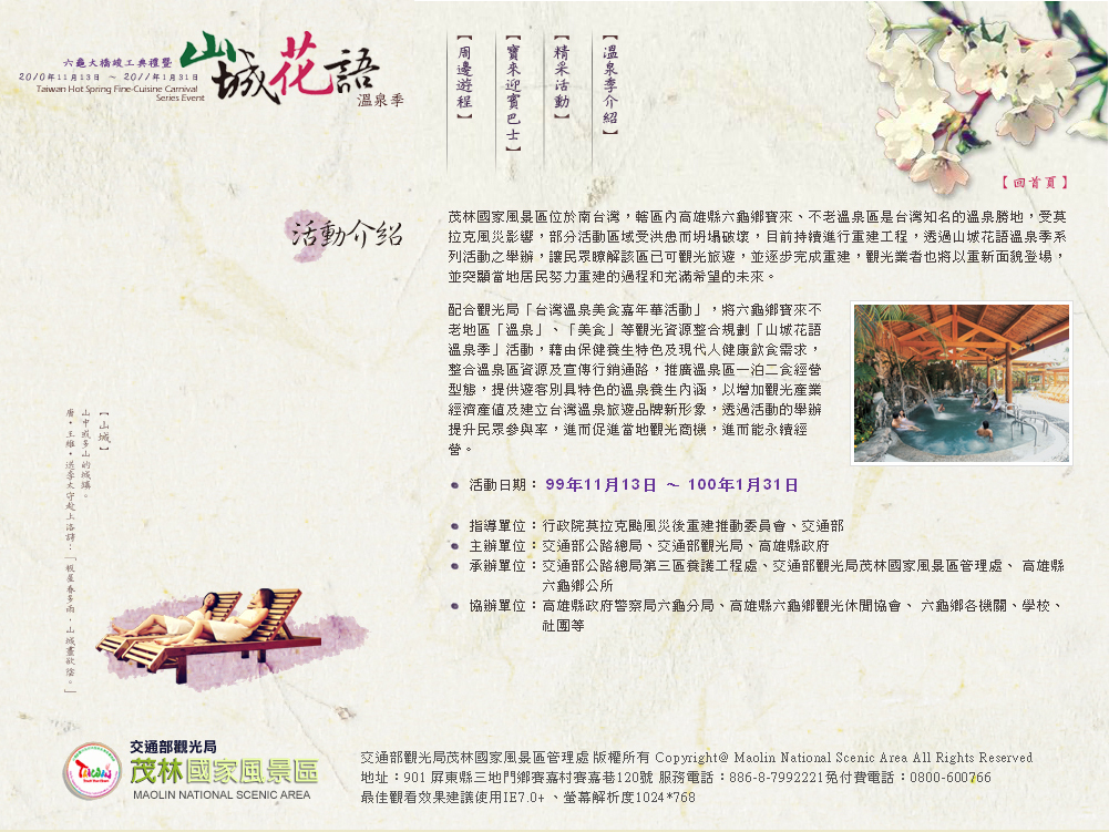 2010山城花語溫泉季 茂林國家風景區管理處 活動網站 November 2010 2012/01/14 In Flash, Web Design, Website ← Previous post Next post →