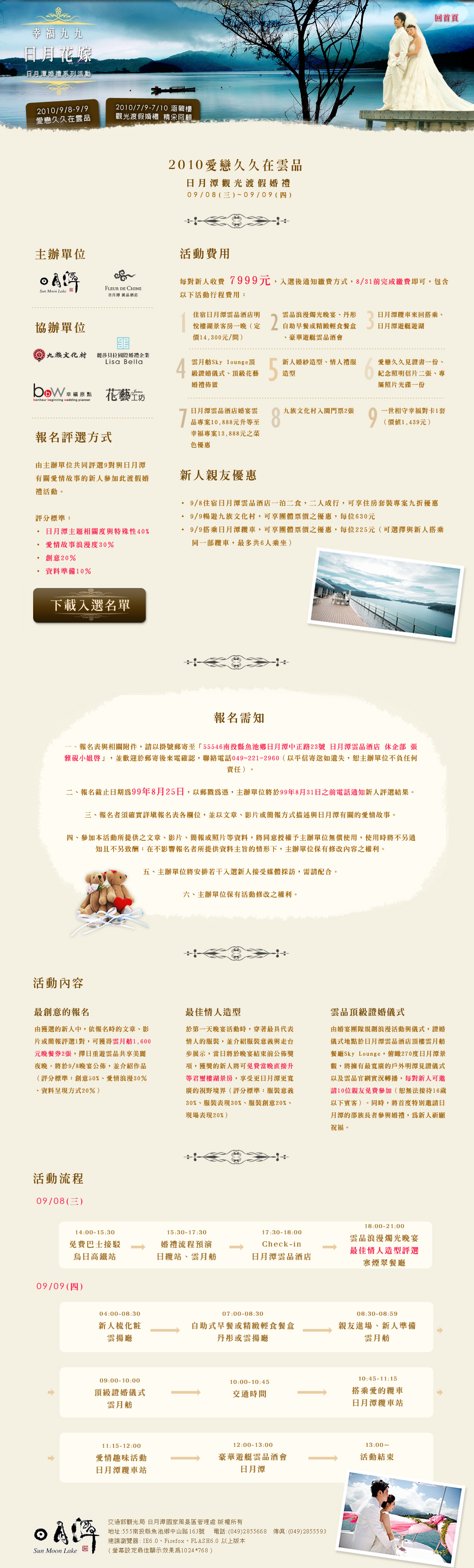 幸福九九 日月花嫁 日月潭國家風景區管理處 活動網站 August 2010 2012/01/14 In Flash, Web Design, Website ← Previous post Next post →